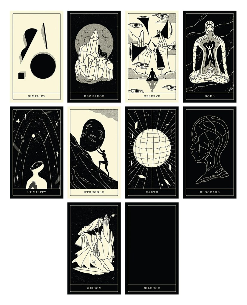 - Art Style: The black and white drawings are highly detailed, with a focus on nature, human connection, and spiritual themes. The lack of color allows the symbolism to take center stage, inviting the reader to focus on the essence of each card.